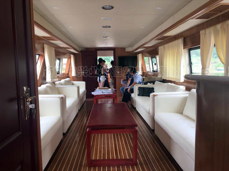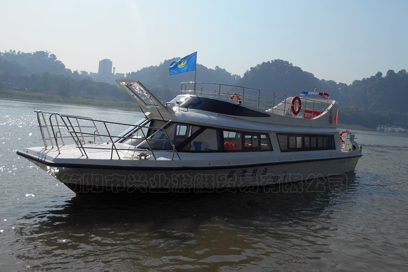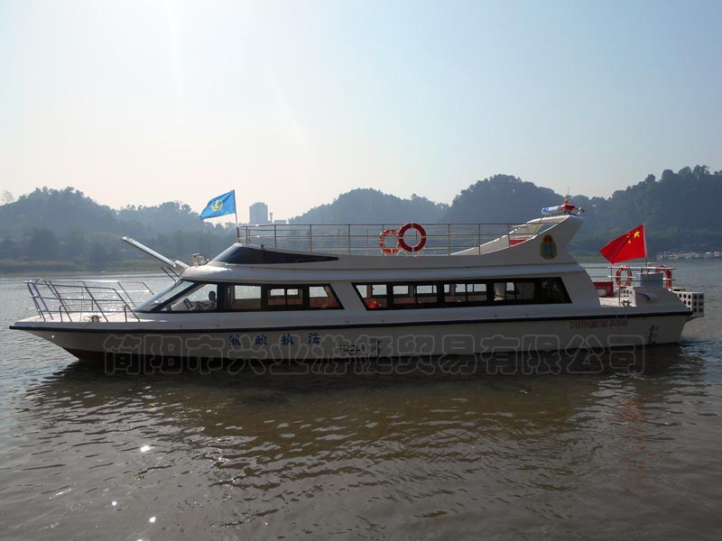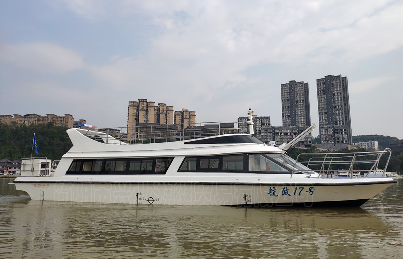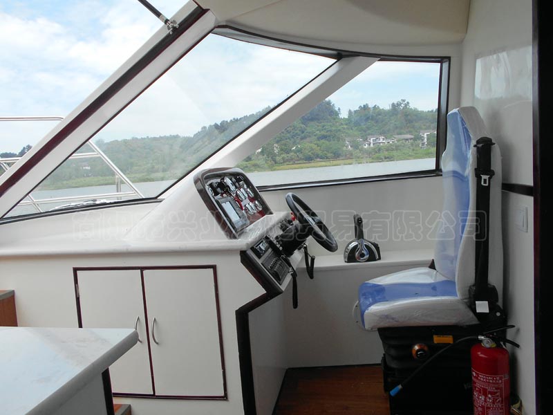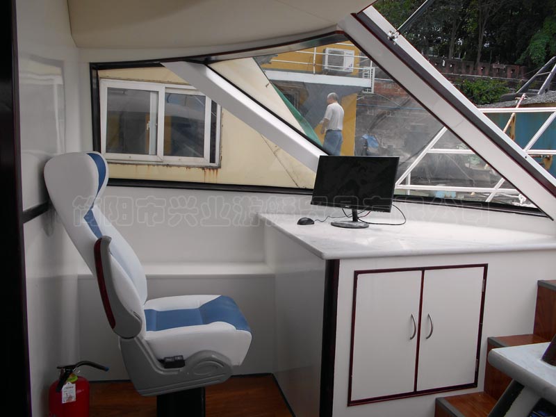 本艇為玻璃鋼材質(zhì)建造,外表面為彩色膠衣樹脂,玻璃鋼原材料為:船用不飽和聚酯樹脂、無堿無捻方格玻璃布,無堿短切玻璃氈,上述產(chǎn)品均為船級社認(rèn)可產(chǎn)品。本艇艇本為縱骨架式結(jié)構(gòu),艙壁為玻璃鋼內(nèi)膽,甲板設(shè)防滑毛面,本艇上層結(jié)構(gòu)殼板為陰模成型。本艇一層為客艙,設(shè)有座椅可供執(zhí)法人員乘坐,二層設(shè)有露天執(zhí)法平臺(tái),可供執(zhí)法人員執(zhí)法。